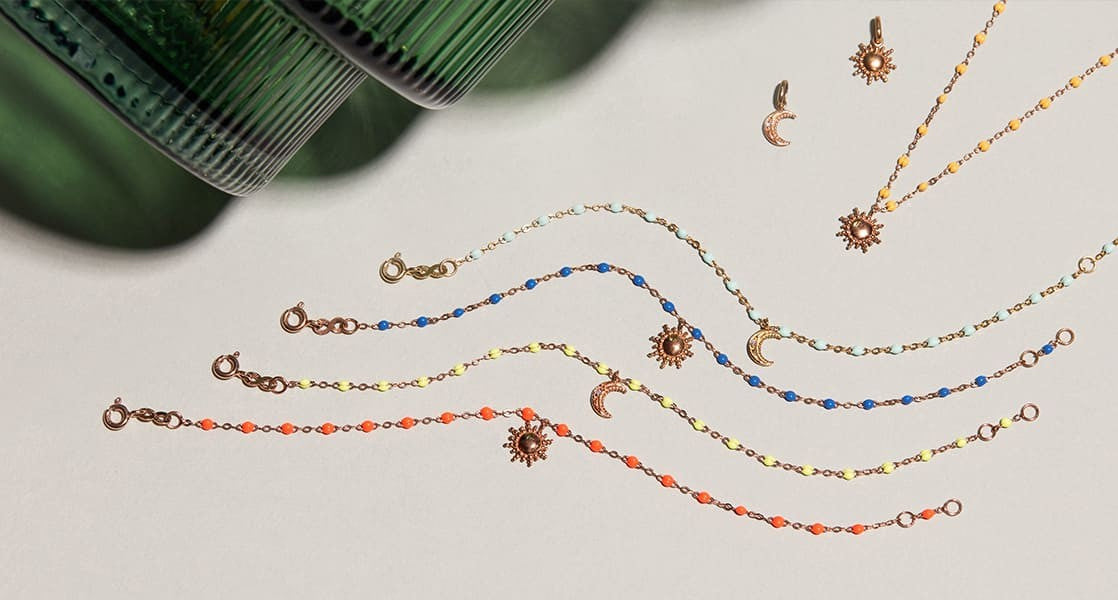 Originaire du sud de la France, Gigi Clozeau s’inspire de l’ambiance colorée et joyeuse de sa région natale pour créer ses bijoux. Le bleu du ciel, le jaune des champs de tournesols ou encore le rose des flamants roses se retrouvent dans ses créations. Cette palette de couleurs vives et ensoleillées fait partie de l’identité de la marque.